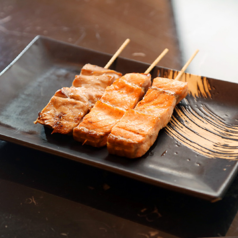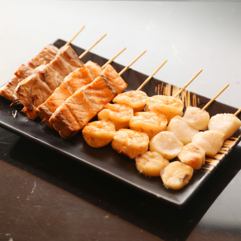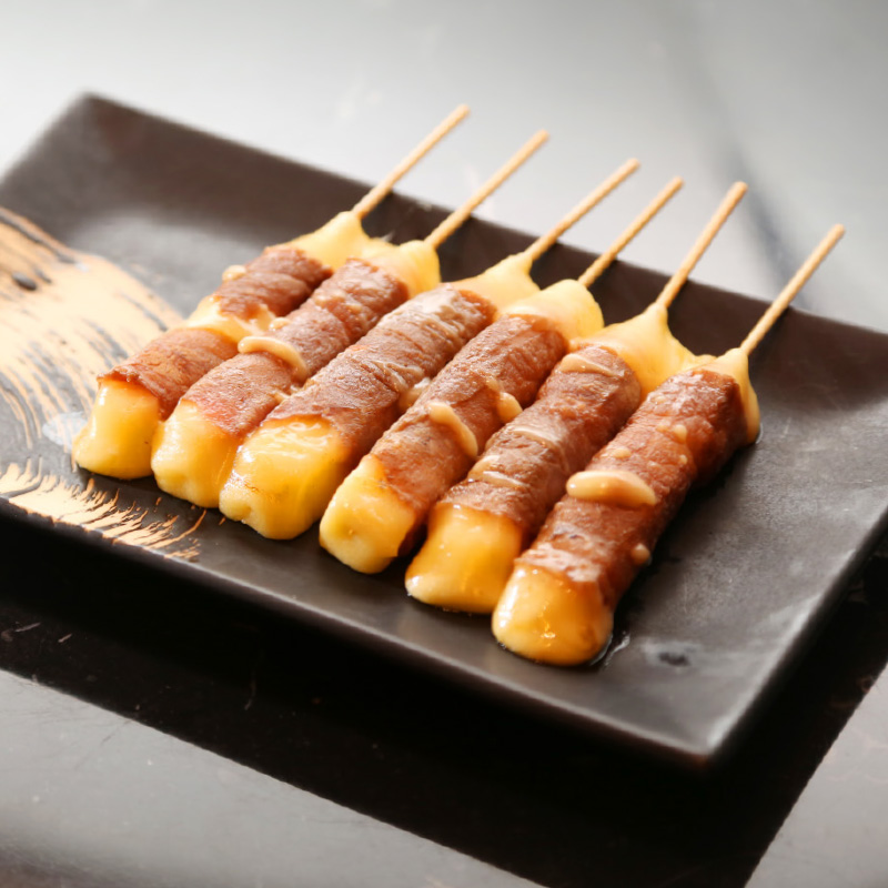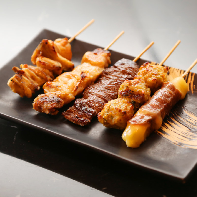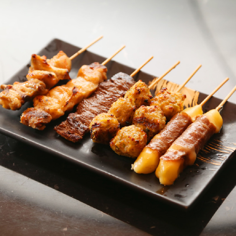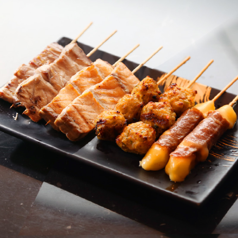 5 brochettes : 1 boeuf au fromage, 1 boulette de poulet