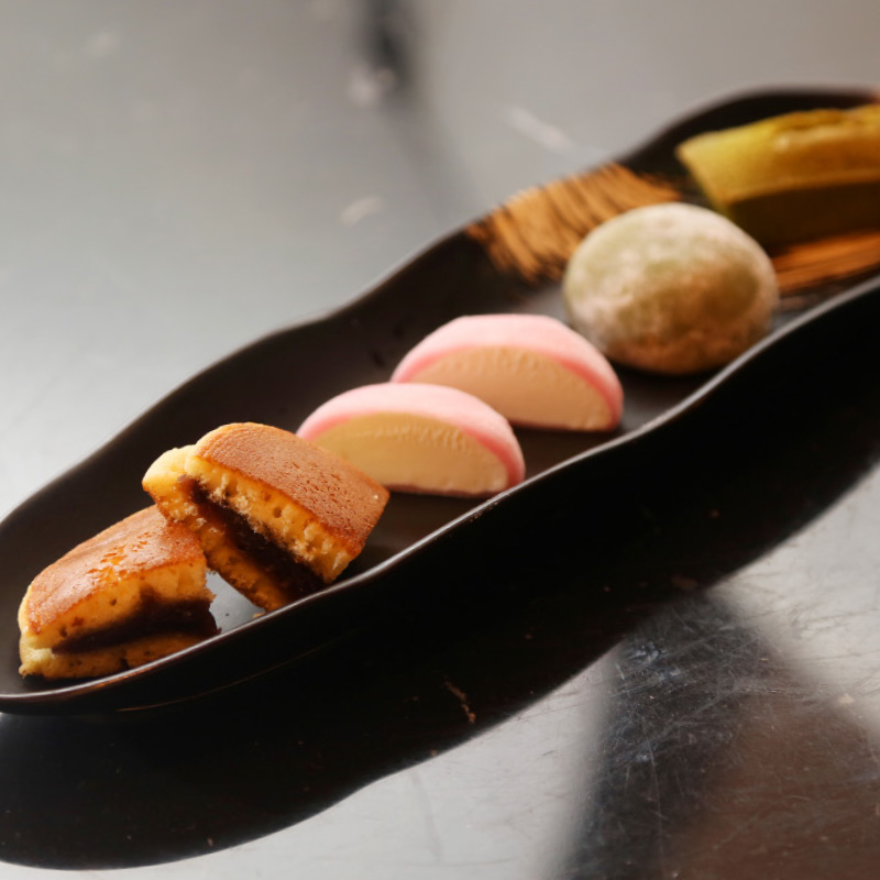 1 Financier thé vert, 1 Mochi, 1 Mochi glacé (Parfum au choix), 1 Dorayaki